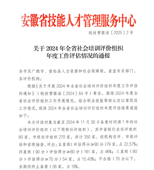 克日,合肥市职业手艺判断指导中心宣布关于转发《关于2024年度全省社会评价组织年度事情评估情形的转达》(皖技管服函〔2025〕2号),我机构依附卓越的事情效果和规范的治理系统,荣获“2024年度五星级社会评价组织”称呼。标记着职业手艺品级认定事情迈入全新阶段。